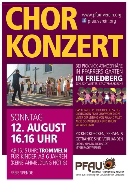 Im August 2018 hatten Gesangsbegeisterte wieder die Möglichkeit an unserem Chorworkshop unter der Leitung von Alois Schausberger, Roland Faust und Phillip Schausberger teilzunehmen. Von 9. bis 11. studierte die Gruppe traditionelle Volkslieder und bekannte afrikanische Stücke ein, die sie dann am Sonntag darauf im kühlen Lindenschatten des Friedberger Kirchgartens zum Besten gab. Wir bedanken uns bei allen Teilnehmern und Besuchern für den tollen Sonntagabend und die vielen Spenden!