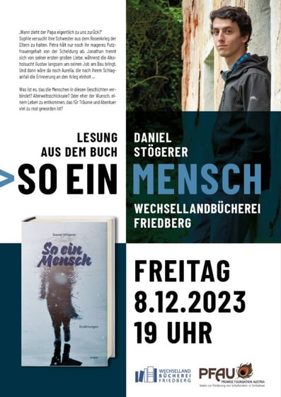 Im Herbst veröffentlicht unser Mitglied Daniel Stögerer sein neues Buch „So ein Mensch“, das vom Wunsch verschiedenster Menschen handelt, sich in ihrem Leben zurechtzufinden. Wir von PFAU werden im November eine Buchpräsentation in Friedberg veranstalten, bei der der Erlös aus dem Buchverkauf unseren Projekten zugute kommt.
